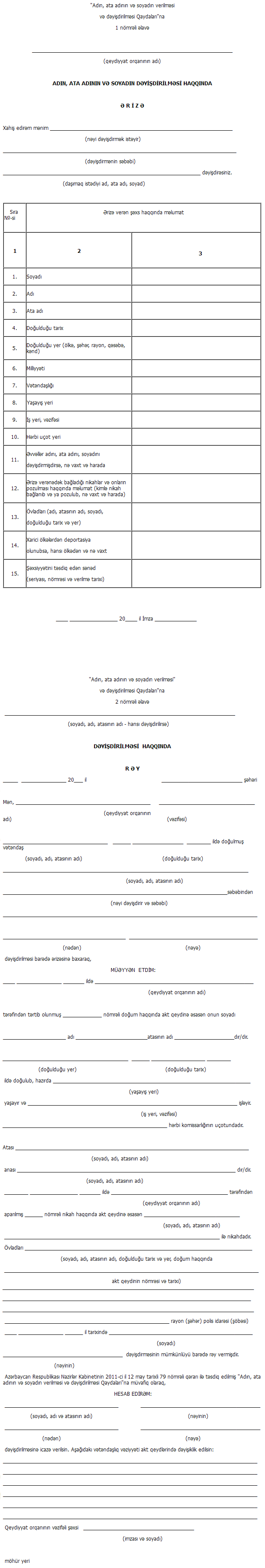 6.6. Adın, ata adının və soyadın dəyişdirilməsi haqqında ərizə (1 nömrəli əlavə) vətəndaşın yaşayış yeri üzrə qeydiyyat şöbəsinə, xarici ölkədə daimi və ya il ərzində 182 gündən artıq müvəqqəti yaşayan Azərbaycan Respublikasının vətəndaşı tərəfindən isə konsulluğa verilir.