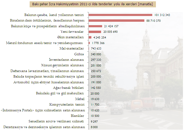 Satınalmalar üzrə Dövlət Agentliyinin saytında yerləşdirilmiş məlumata görə 2011-ci ildə Bakı şəhər İcra Hakimiyyəti 221 milyon 117 min manatlıq tender keçirib. Keçən il keçirilmiş tenderlərlə tanışlığı davam etdiririk.