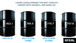 Prezident deyib ki, 2009-cu ildə «Azəri», «Çıraq» yataqlarında bizə verilən hasilat proqnozu 46,8 milyon ton idi. Faktiki isə 40,3 milyon ton səviyyəsində neft hasil edilmişdir. 2010-cu ildə proqnoz 42,1 milyon ton idi, fakt 40,6 milyon ton olmuşdur. 2011-ci ildə proqnoz 40,2 milyon idi, real hasilat isə 36 milyon. 2012-ci ildə verilmiş proqnoz 35,6 milyon tondur. İndiki hasilatı nəzərə alaraq belə təxmin etmək olar ki, ilin sonuna qədər BP «Azəri», «Çıraq» yataqlarından 33 milyon tondan artıq neft hasil edə bilməyəcəkdir.
