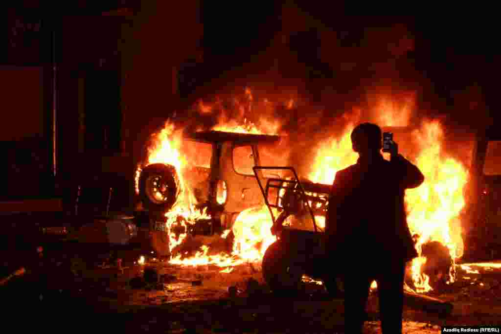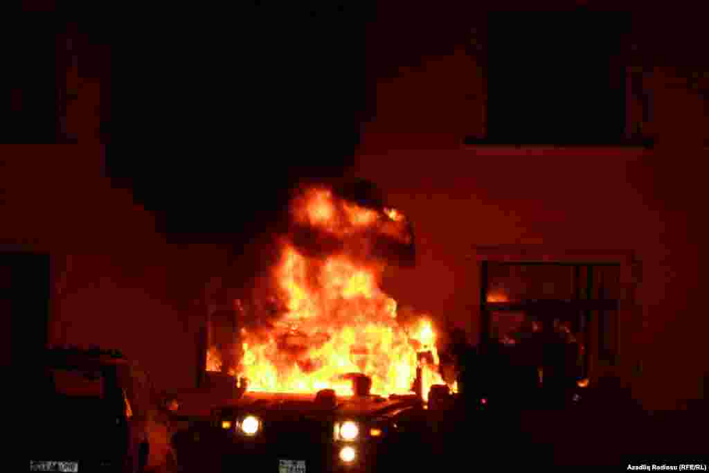 Ərazidə olan Əmək və Əhalinin Sosial Müdafiəsi naziri Füzuli Ələkbərovun oğlunun maşını da daxil olmaqla bir neçə bahalı avtomobili yandırılıb. AzadlıqRadiosu hadisə yerindən fotoları təqdim edir: