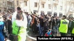 15.09 Заместитель председателя партии «Ени Азербайджан» Али Ахмедова и депутат Мубариз Гурбанлы также находятся на площади Фонтанов. Пока на площади можно заметить только полицейских и журналистов.