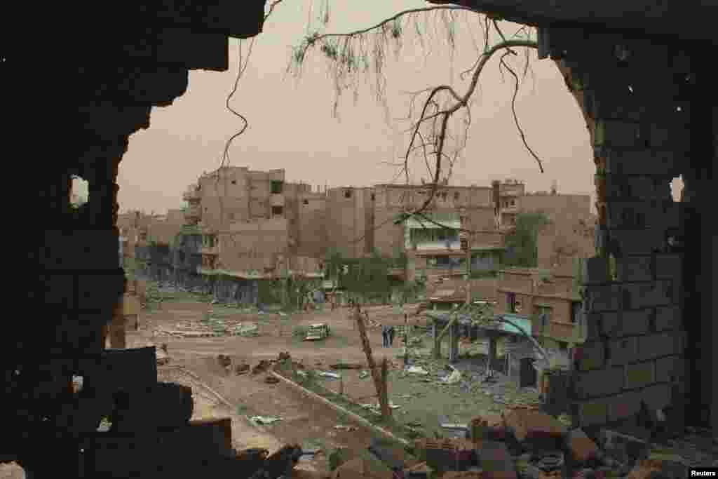 Syria -- Women stand in a street lined with damaged buildings in Deir al-Zor, 07Apr2013