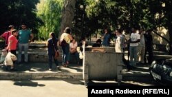Məhəkəməyə gələnlərə mane olmaq üçün məhkəmə binasının qarşısına mənzil istismar sahələrinə məxsus iri zibil qabları qoyulub. Jurnalistlər zibil qablarının arxasında gözləyirlər.