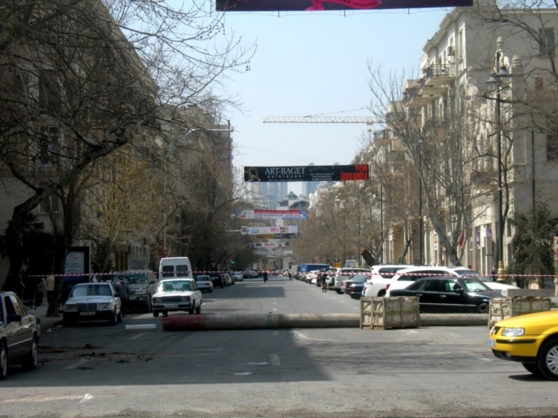 Улица 28 мая, перекрыта с двух сторон, возможно, как основная магистраль, ведущая к скверу «Сахиль» (ранее - имени 26 бакинских комиссаров).