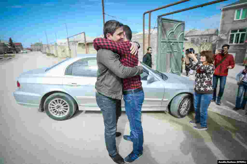 Həbsdən çıxan gənci ailəsi, dostları və qohumları qarşılayıblar.