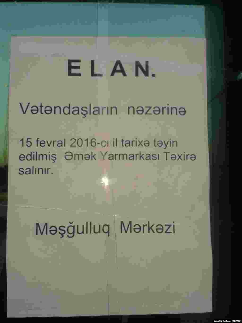 Bu şəkilləri AzadlıqRadiosuna saytımızın oxucusu Ağdamdan yollayıb. Onun verdiyi məlumata görə, fevralın 15-də rayonda əmək yarmarkası keçiriləcəyi elan edilibmiş. Amma yarmarkanın keçiriləcəyi idman kompleksinin önünə toplaşan insanlar "təxirə salınıb" elanı ilə qarşılaşıblar. Məşğulluq İdarəsinə yollanan insanlara da yarmarkanın təxirə salındığını deyiblər. Bundan sonra onlar rayon icra hakimiyyətinə yürüş ediblər. İcra başçısının müavini onların qarşısına çıxaraq yarmarkanın sentyabrda keçiriləcəyini söz verib... Buna da bax: Şirvanlılar iş tələb edir (Fotolar)