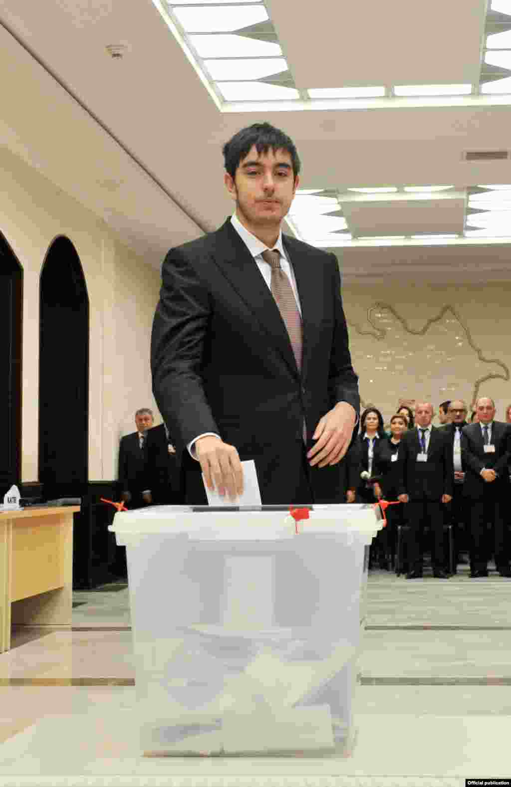 Məntəqə seçki komissiyasının sədri Rüfət Həsənov ilk dəfə səs verməsi münasibətilə İlham Əliyevin oğlu- Heydər Əliyevi Mərkəzi Seçki Komissiyasının adından təbrik edib.