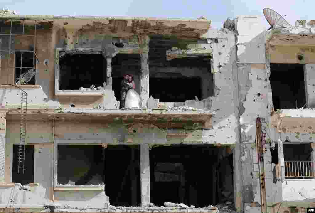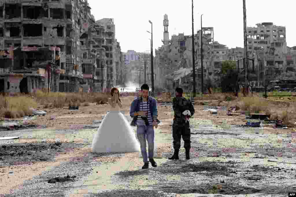 Ağır döyüşlərin dağıtdığı Homs şəhərində ailə quran 27 yaşlı Həsənlə 18 yaşlı Nadinin fotoları.